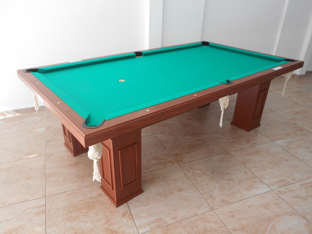 Color: cedro Medidas: 2.50 x 1.40 x 0.80 mts. (8 pies, medida reglamentaria). Madera de la base: melamina 18 mm. de espesor. Madera de las patas cuadradas 25 x 25 cm.: melamina 18 mm. de espesor. Madera de las bandas: melamina MDF 18 mm. de espesor. Goma de las bandas: Fair K55 (Importadas). Paño: color verde, azul o rojo de 22 hilos. Terminaciones: nacaroles incrustados en bandas, molduras y zócalos en patas. |
